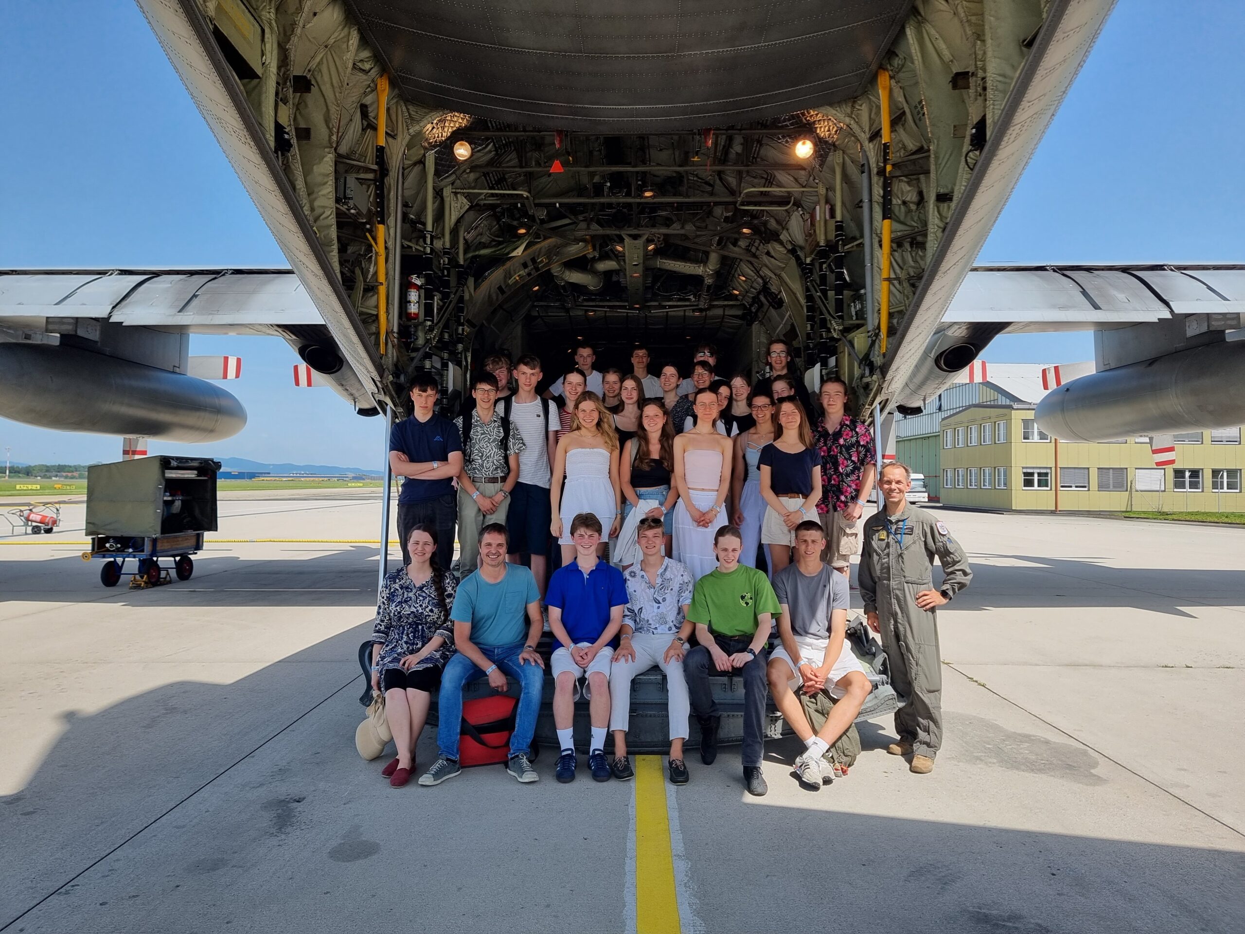 Ein besonderes Highlight war die Besichtigung des Transportflugzeugs „Hercules“ am Militärflughafen Hörsching. Aus nächster Nähe konnten wir sehen, wie beeindruckend dieses Flugzeug gebaut ist und welche technischen Details hinter seiner enormen Leistung stehen. Die Schüler*innen durften einen Blick ins Cockpit werfen, Fragen stellen und erfuhren, wie vielfältig die Einsatzmöglichkeiten der Hercules-Maschine sind – von Truppentransporten bis hin zu humanitären Hilfseinsätzen.